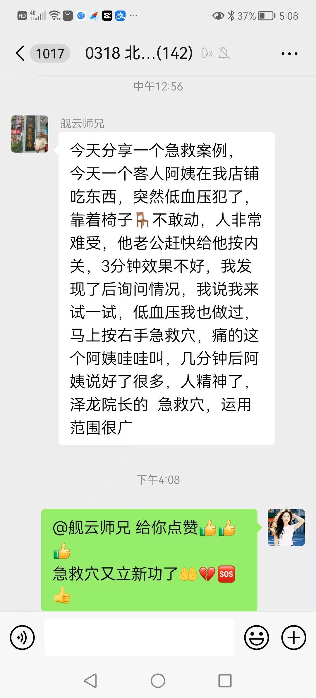 这是来自广西0318群周建云大使2025年8月27日的分享,急救穴成功急救一突犯低血压的女顾客。