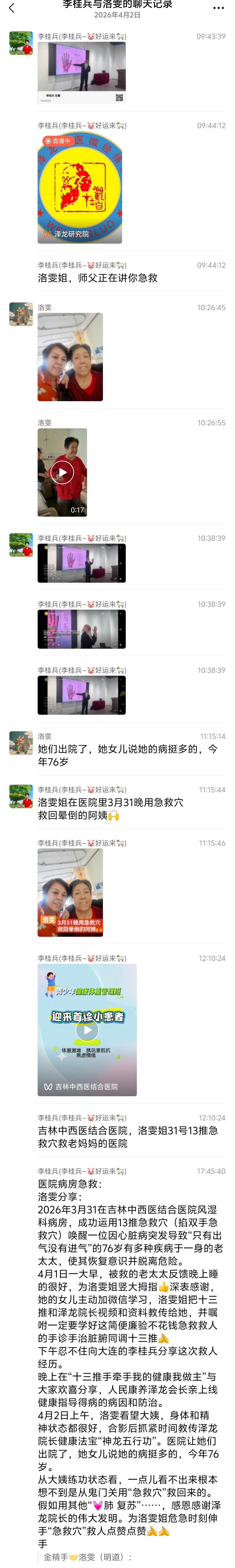 4月1日一大早,被救的老太太反馈晚上睡的很好,为洛雯姐竖大拇指深表感谢,她的女儿主动加微信学习,洛雯姐把十三推和泽龙院长视频和资料教传给她,并嘱咐一定要学好这简便廉验不花钱急救救人的手诊手治脏腑同调十三推下午忍不住向大连的李桂兵分享这次救人经历。